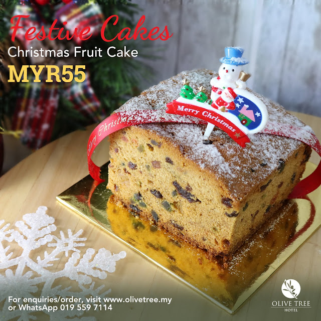 The fruit cake here at Olive Tree Hotel comes with the right balance of fruits, nuts, and rich batter, this flavourful fruit cake serves as the ideal Christmas dessert. A perfect treat to family and friends or a Christmas gift. With only RM 55.00 it is weight at 500g and order lead time is 3 days after payment is received.
